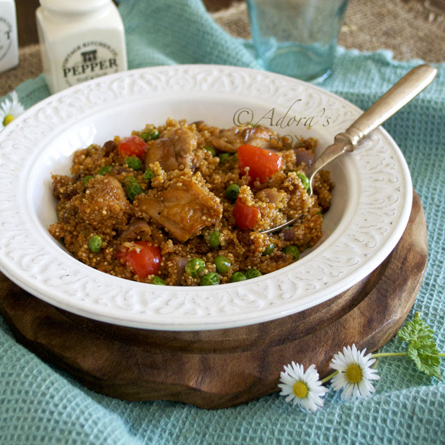 Add the tomato puree, chicken, sultanas, paprika, black pepper, cayenne, sweet red pepper and stock. Bring to a boil, cover and simmer until the quinoa is cooked. I like my quinoa with a bit of bite so I cook it just until the tails are starting to come out. If you want it softer, cook further until the quinoa is completely translucent and the tails have come out. You can add a little more stock if the mixture becomes too dry before the quinoa is cooked.